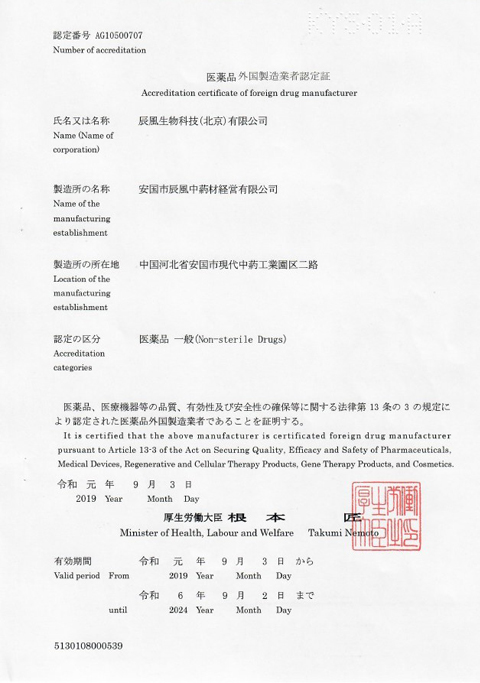 公司于2019年9月3日獲得由日本厚生勞動(dòng)省認(rèn)證的“醫(yī)藥品外國(guó)制造業(yè)者認(rèn)定證”。這意味著公司產(chǎn)品在品質(zhì)性、有效性及安全性保證方面獲得了日本政府的高標(biāo)準(zhǔn)認(rèn)可,為公司國(guó)際市場(chǎng)擴(kuò)展打下了堅(jiān)實(shí)基礎(chǔ)。