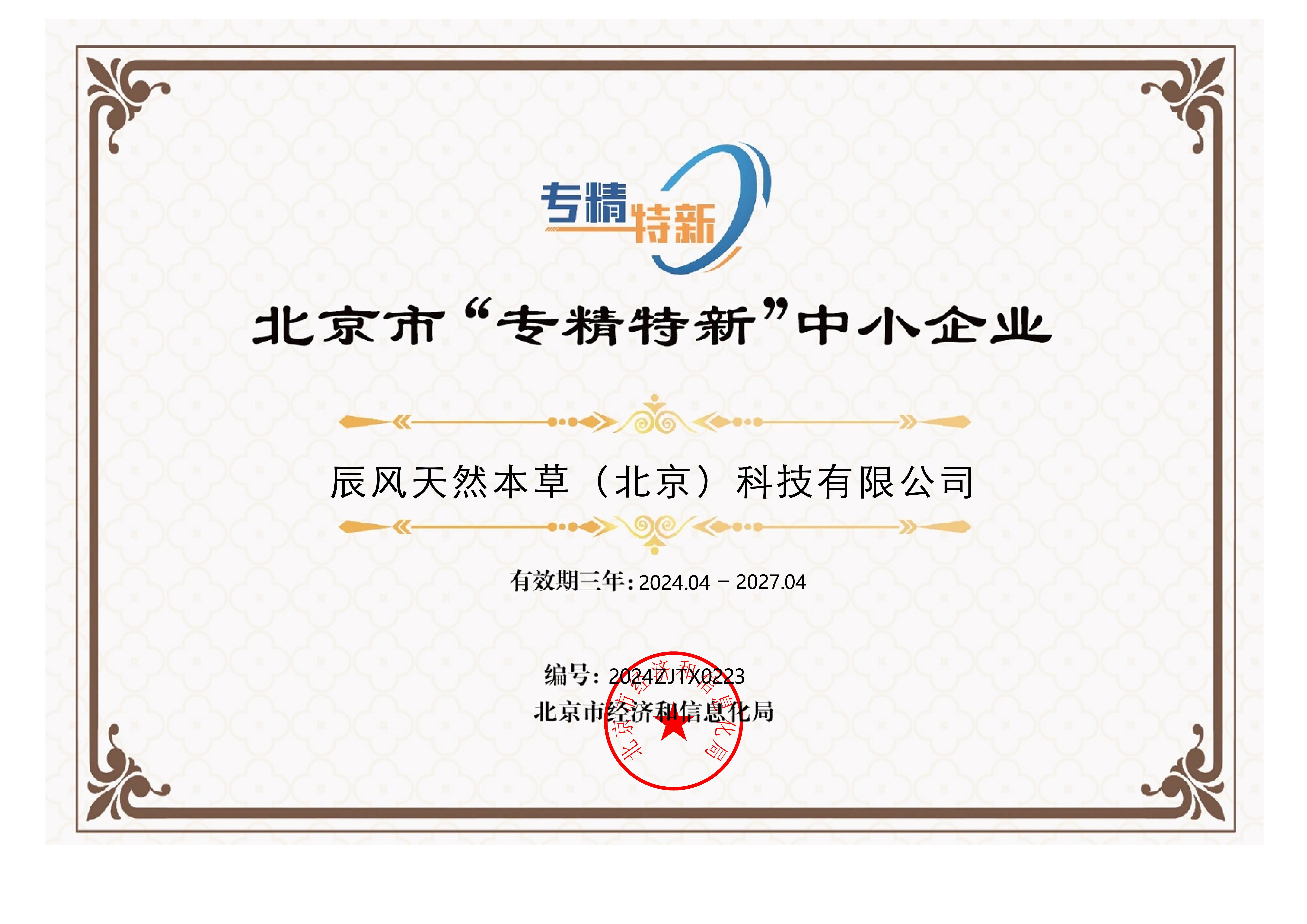2024年,辰風(fēng)天然本草(北京)科技有限公司和辰風(fēng)生物科技(北京)有限公司分別榮獲北京市“專精特新”中小企業(yè)稱號,在行業(yè)和市場中具有較高的影響力和認(rèn)可度。作為國家產(chǎn)業(yè)政策的重點扶持對象,辰風(fēng)將堅持創(chuàng)新驅(qū)動,提升自身競爭力和發(fā)展?jié)摿?,努力成為中小企業(yè)的領(lǐng)軍者和行業(yè)的明星,做好市場導(dǎo)向、技術(shù)核心、高效管理等方面的工作,實現(xiàn)高質(zhì)量發(fā)展,為國家經(jīng)濟社會發(fā)展做出貢獻。