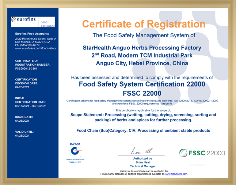 經(jīng)過半年多的緊張準(zhǔn)備工作,2021年4月28日辰風(fēng)集團(tuán)下屬工廠------安國辰風(fēng)中藥材經(jīng)營有限公司獲得了由第三方認(rèn)證機(jī)構(gòu)歐陸集團(tuán)(Eurofins)頒發(fā)的FSSC22000食品安全體系認(rèn)證證書,標(biāo)志著公司質(zhì)量體系建設(shè)邁上了新臺階。