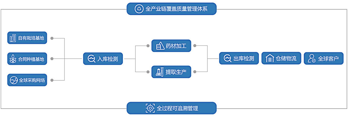 公司嚴(yán)格按照GACP,GMP, HACCP等體系和標(biāo)準(zhǔn),從種植到生產(chǎn)加工、倉儲物流各環(huán)節(jié)建立了覆蓋全產(chǎn)業(yè)鏈的完善的質(zhì)量管理體系,實現(xiàn)了全程可追溯,確保生產(chǎn)出合格的產(chǎn)品。